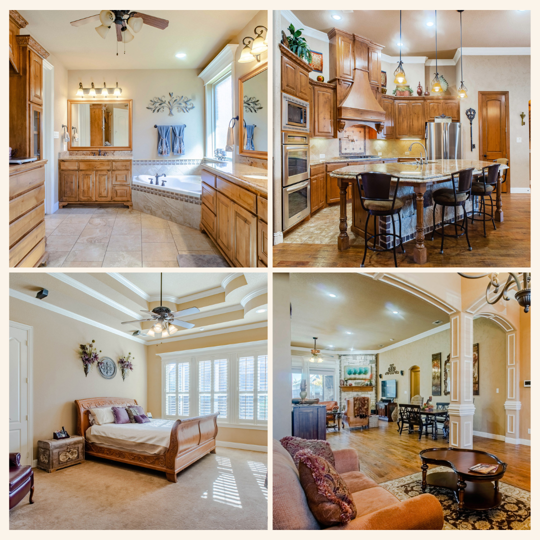 As you enter the foyer look up to see soaring ceilings and new luxury vinyl wood floors, leading to the private study with split light French doors and a spacious formal dining. The heart of the home is an amazing kitchen with built-in stainless appliances, granite counters, natural stone backsplash, large island, 42-inch shaker cabinets throughout, gas cooktop, wine fridge and spacious pantry. 👩🍳 The modern open concept brings together the kitchen, breakfast and family room with a gorgeous gas stone fireplace and hearth. You'll love the arched openings, rounded corners and exposed beams. The home features a split bedroom arrangement with a mother-in-law suite upstairs! The beautiful private master down stairs features an oversized, soaking tub, split vanities, and framed mirrors.