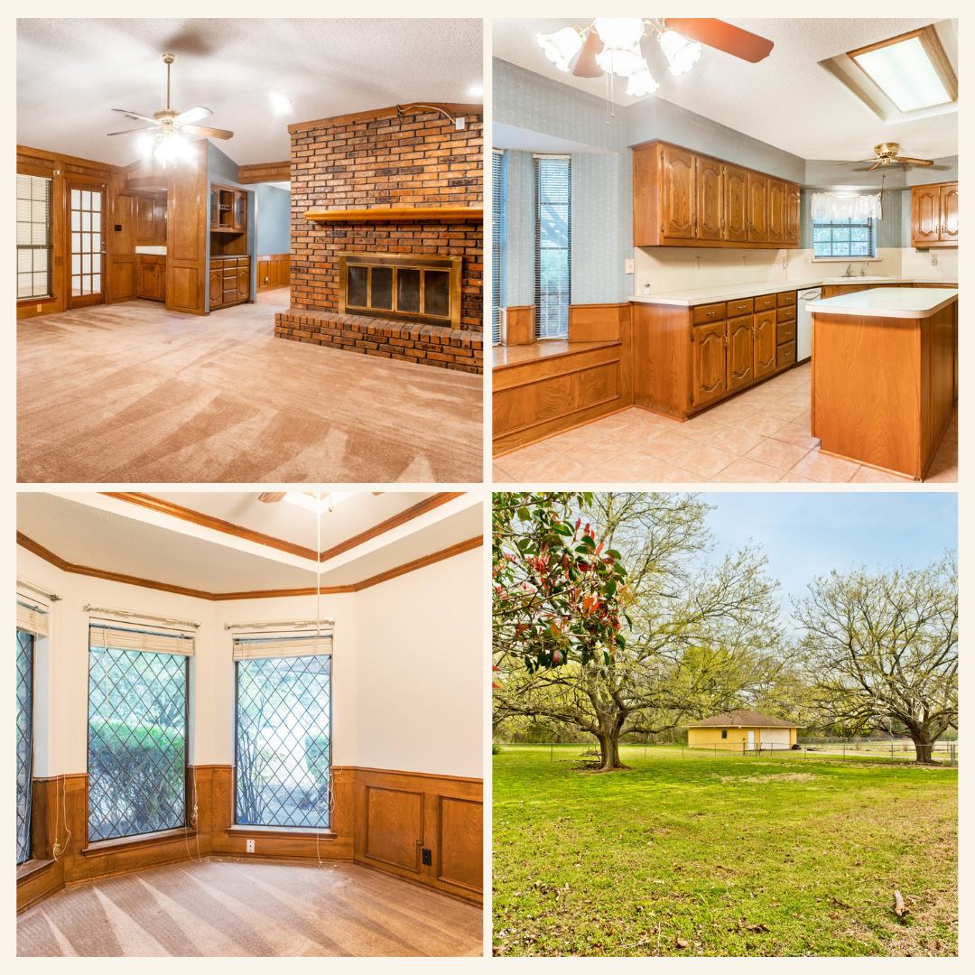 This charming brick house on a 1.2 acre property offers over 2,100 sq ft of living space with 3 beds, 2 baths, and 2 living areas. The primary living room features a large brick wood burning fireplace, and the wet bar area is perfect for entertaining.🍸