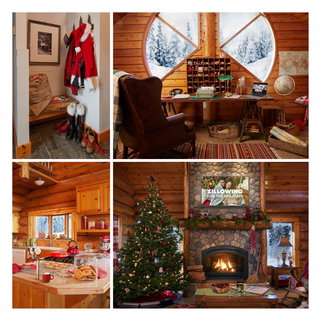 The rustic mini cabin is made of hand hewn logs and brimming with personality, which is evident from the serving cart stocked with sugary potions, and the butcher block desk that nods to the elf’s status as Head of Toys, Woodworking Division.