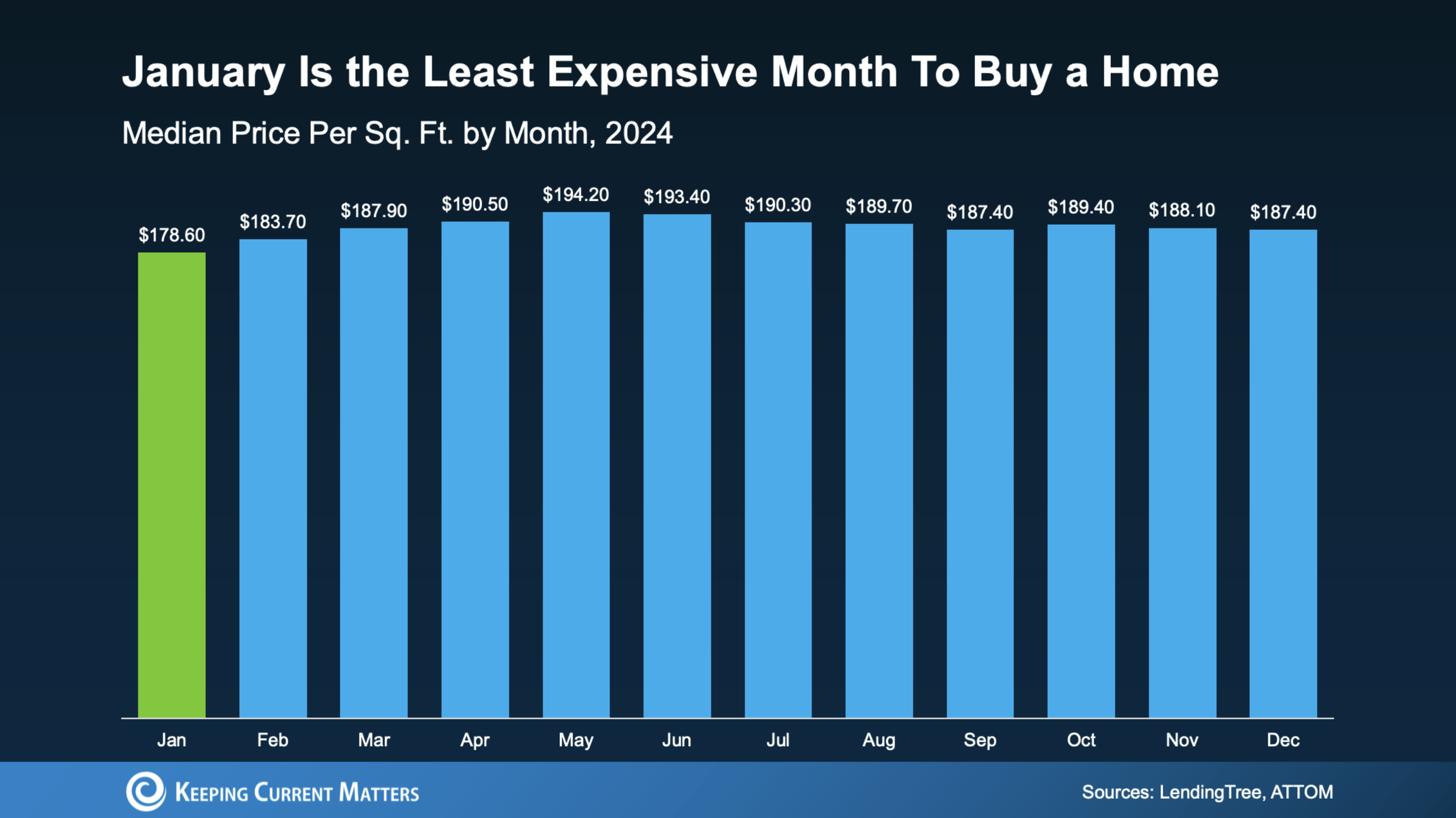 Historically, January has been one of the least expensive months to buy a home. Market data shows that price-per-square-foot is often at its lowest point this time of year, while prices typically peak during the busy spring months.