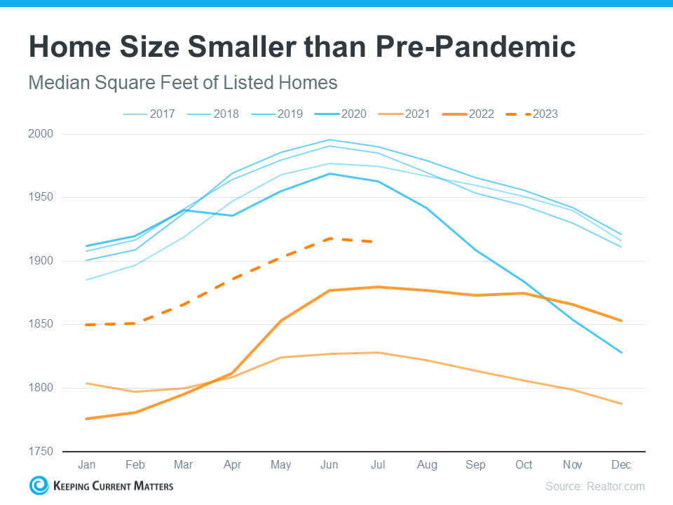In some ways, smaller homes are already here. When the pandemic hit, the meaning of home changed. People needed the space their home provided not only as a place to live, but as a place to work, go to school, exercise, and more. Those who had that space were more likely to keep it. And those that didn’t were in a position where they were trying to sell their smaller house to move up to a larger one. That meant the homes coming to the market during the pandemic were smaller than those on the market before the pandemic – and that trend continues today (see graph below):